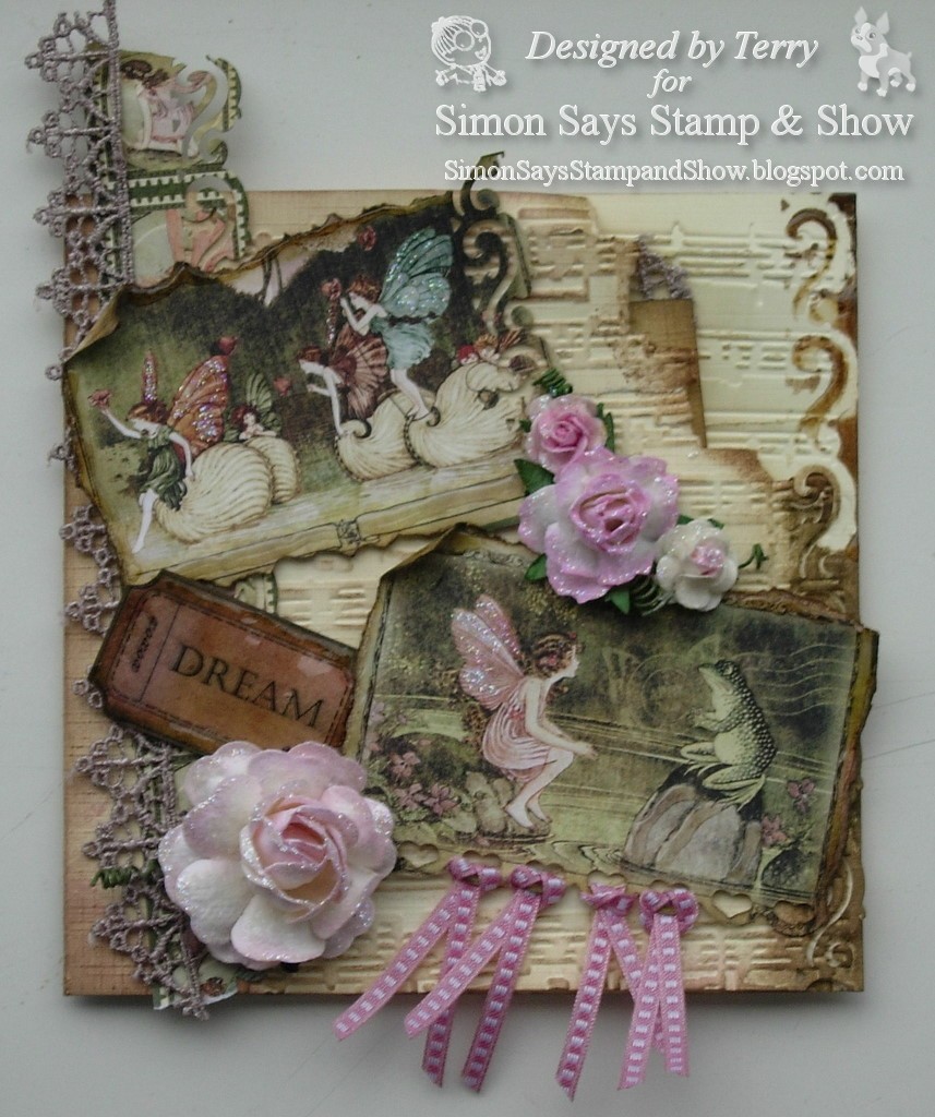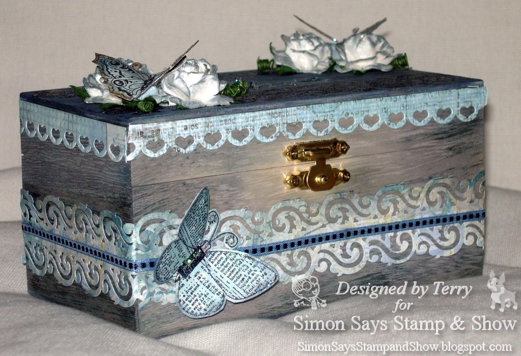 Terry made a Teabox, surrounded by lots of love....the heartshaped border is from Whiff of Joy, the teabox is worked on with distress inks, colors are Weathered Wood, Stormy Sky, Faded Jeans. On the front she placed the fabby butterfly from Wendy Vecchi and on top of the box she placed some white roses worked on with the distress rock candy, stickles and glossy accents from Tim Holtz and also the Distress inks.