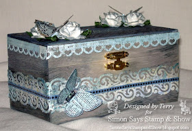 Terry made a Teabox, surrounded by lots of love....the heartshaped border is from Whiff of Joy, the teabox is worked on with distress inks, colors are Weathered Wood, Stormy Sky, Faded Jeans. On the front she placed the fabby butterfly from Wendy Vecchi and on top of the box she placed some white roses worked on with the distress rock candy, stickles and glossy accents from Tim Holtz and also the Distress inks.