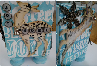 A first for Tracy, a CHUNKY ATC, one which she thoroughly enjoyed making using Tim's Season's Silhouettes and Odds And Ends set of stamps. The ATC was painted with an undercoat of Claudine Hellmuth's Gesso and a top coat of Distress Stain Broken China. Tracy used all four sides to the max, decorating each with Tim's Reindeer Flight and adding a couple of the special Christmas Adornments from Tim. Noel, Joy and Christmas were added to jump rings, a favourite technique of Tracy's at the moment.