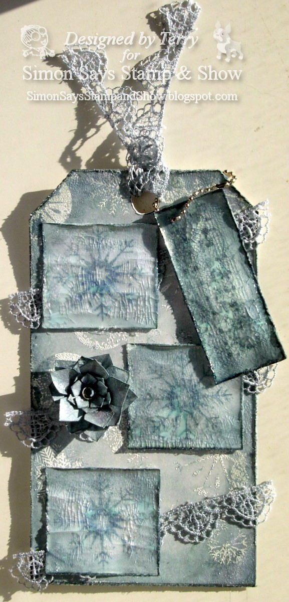 Terry made a Christmas Tag with lots of snowflakes and the fabulous colour Weathered Wood. The snowflakes were heat embossed and worked on with Distress Crackle Paint clear rock candy to give it the frosty look. The sentiment is from the Crafty Secrets Stampset Vintage.
