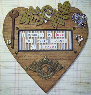 Ellen VargoEllen decided to incorporate antique hardware, key and pin for her "something old" with new art parts by Studio 490 and a quote from the "Twilight" book. She started with the large heart frame, coloring the top frame with brushed corduroy distress stain and stamping with the script stamp, then added the art part leaf/scroll, coloring with crushed olive distress stain, and stamping with forest moss distress ink and embossing that with clear embossing powder. Added some antique findings along with some new, and stamped the quote with a mini alpha set .