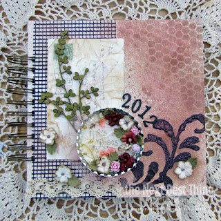 Linda used lots of her favorite oldies (Fabulous Flourishs stamp, Elegant Flourishs die, Tag and Bookplates die, LOVE stamp from Stuff to Say, Picket Fence distress crackle paint) on this project, but her "old" highlights are the four wonderful vintage buttons sent to her recently by a friend. Her "new" is the tattered rose created with her newly acquired Tattered Pinecone die and the seam binding dyed just for this project with a blend of Aged Mahogony and Tattered Rose distress inks. With the new year upon us, it's a time to ponder on the past year and to look ahead to the new beginning!! Lynne's not one for resolutions, so this year she's created a monthly goal art journal. She dug into her stash for something old....Magic Mesh, ATC pages and a piece of vintage lace. For new things....she used a Berry Vine wood flourish colored with Peeled Paint Distress Stain. The Super Mega Bottle Cap with an ATC in the background, filled in with Crackle Accents and accented with flowers. With the Chicken Wire template she spritzed the cover with Vintage Photo Reinker mixture and Forever Red Perfect Pearls. She bound her whole album with her Bind it All.