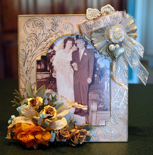When Candy saw the first challenge of the new year is "Something Old, Something New"; she immediately thought of weddings. Something old, something new, something borrowed, something blue. So, she decided to mimic those beautiful ornate cabinet card pages from vintage photo albums to create a "vintage" wedding frame. She began with Tim Holtz' Vintage Cabinet Card and Small Easel die cuts. She used Tim's Fabulous Flourishes and Queen's Gold Embossing Powder to recreate the beautiful ornate matting. She added Tim's Distressed Doily and his Tattered Pine Cones; which are not pine cones but sweetheart roses, a Tattered Flower and greenery die cut from Tim's Tattered Flowers, and a embellished Rosette to complete her beautiful "vintage" wedding frame.