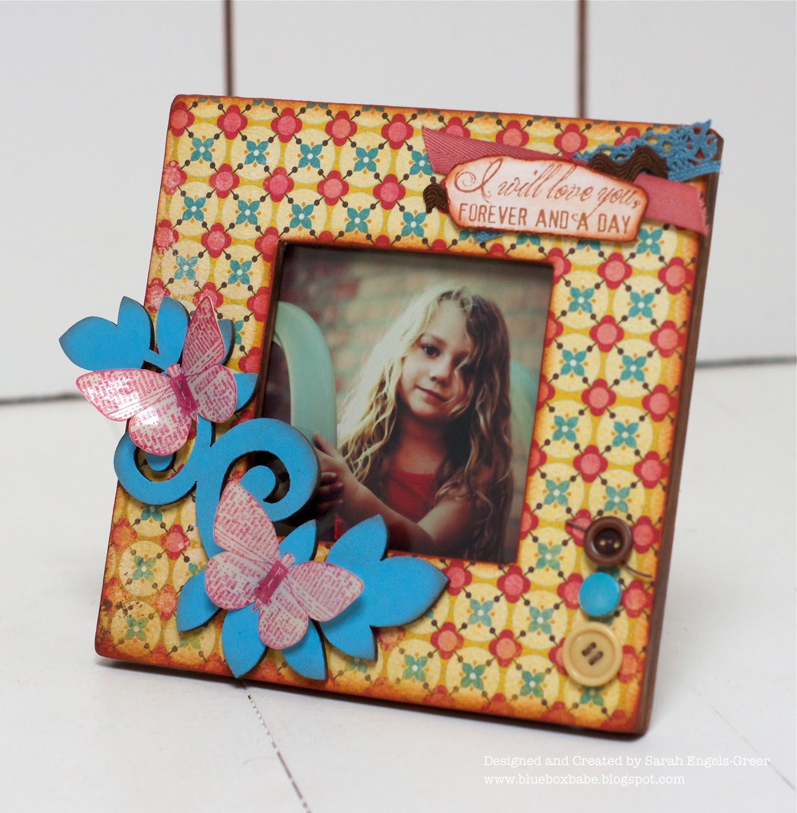 After lots of tinsel, turkey and indulgence, Sarah was in the mood for spring colours and stress free crafting. She took an old wooden photo frame and covered it using Design paper from My Mind's Eye Gertie Range edged with Aged Mahogany Distress Ink. She added Art Parts leaves painted with Claudine Hellmuth paint, two Just Fly butterflies from Wendy Vecchi and finished off with a sentiment and vintage buttons.