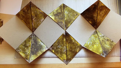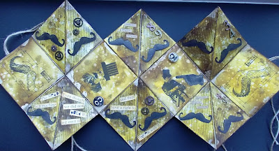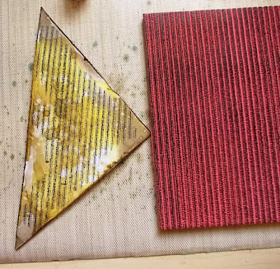 At this stage it is a good idea to trim each piece very slightly for a perfect fit onto the exploding card if desired. I will be distressing the edges, so I did not trim anything away. Note that I distressed the edges of these triangles and squares before coloring.