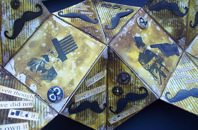 I wanted to try something a little different this week, a card with movement and more detail so I opted for an exploding card. My front cover showcases the fabulous Wendy Vecchi So Serious handsome gent stamp (who has a striped hat!) set against an inky backdrop created with Distress Stains wild honey and walnut stain. The sentiment from Wendy