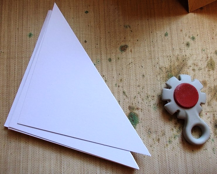 Now it's time to decorate. Cut 4" x 4" squares of white cardstock (twelve total). Then take six of those, and cut them along the diagonal into triangular pieces. This will give you six squares and twelve triangles total.